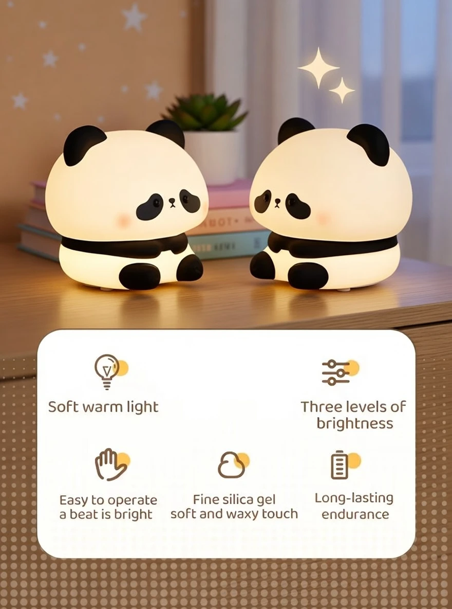 Made with soft silicone material, this USB rechargeable panda night lamp is safe for children and easy to use. Its touch control system allows users to switch brightness levels smoothly, while the 1200mAh rechargeable battery ensures long-lasting performance.